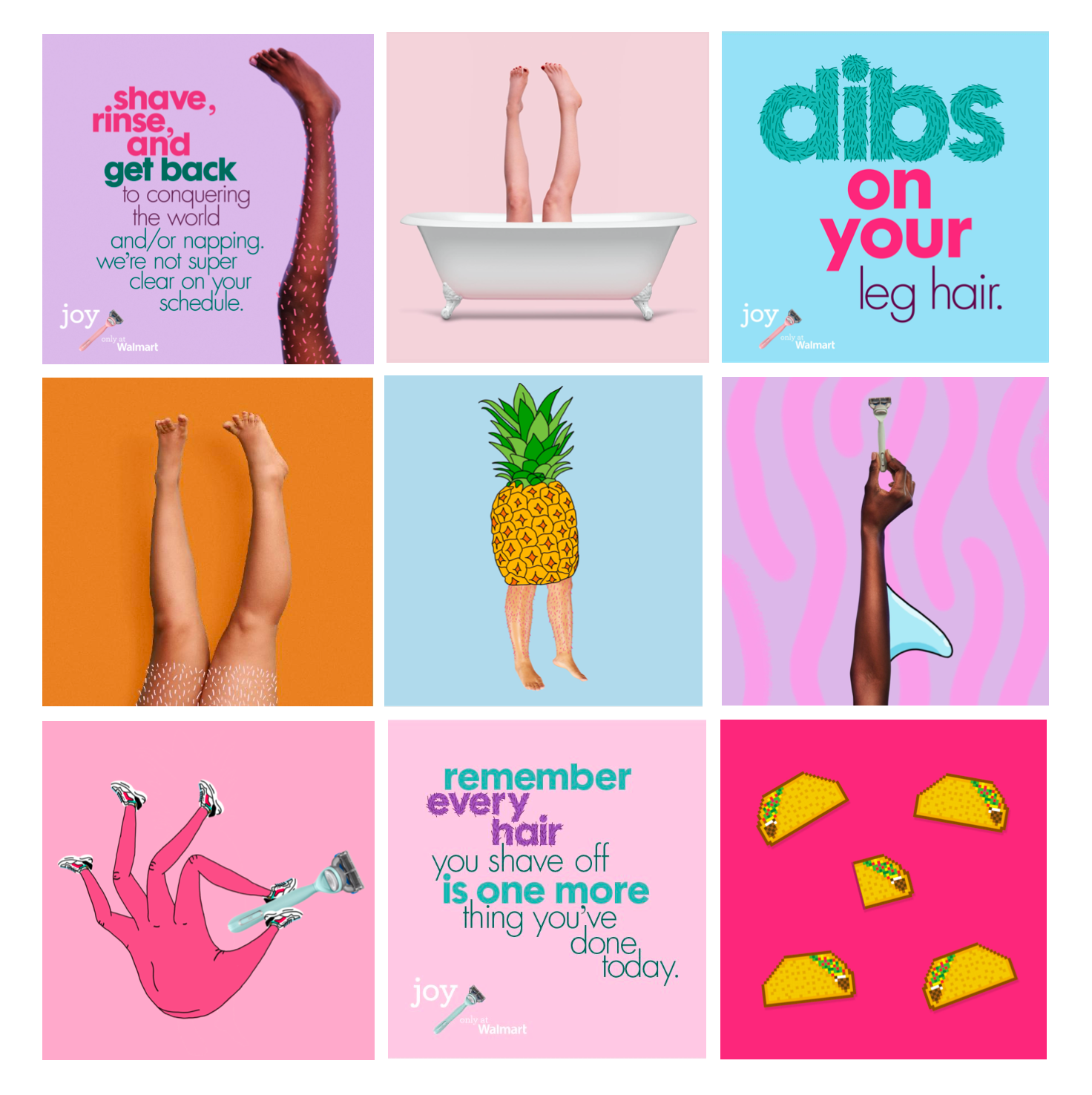 The iconic razor brand, Gillette came to W+K to launch Joy, a new sub-brand of razors and shave products. Our team introduced the brand through film and social content, while also working with Walmart on site reskins and packaging approvals. As the illustrator on the team, I created a playful set of illustrations (complete with matching leg hair) used across social, web, and packaging.